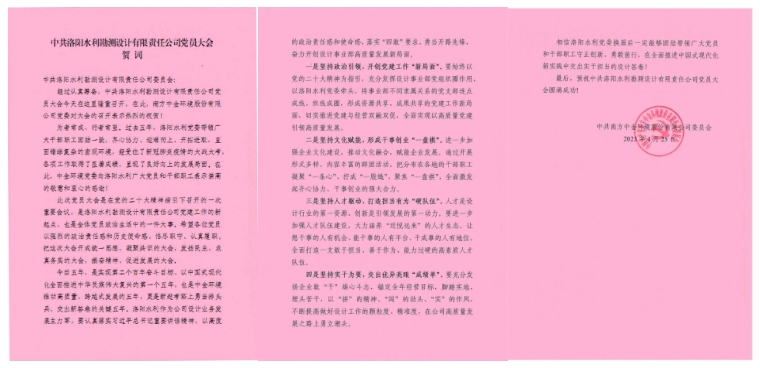 中共南方中金環(huán)境股份有限公司委員會發(fā)來賀詞。為者常成,行者常至。過去五年,洛陽水利黨委帶領(lǐng)廣大干部職工團(tuán)結(jié)一致、開拓進(jìn)取,直面錯綜復(fù)雜的宏觀環(huán)境,各項工作取得了顯著成績。中金環(huán)境黨委向洛陽水利廣大黨員和干部職工表示崇高的敬意和衷心的感謝!洛陽水利作為公司設(shè)計業(yè)務(wù)發(fā)展主力軍,要認(rèn)真落實習(xí)近平總書記重要講話精神,落實“四敢”要求,奮力開創(chuàng)設(shè)計事業(yè)部高質(zhì)量發(fā)展新局面。相信洛陽水利黨委換屆后一定能夠團(tuán)結(jié)帶領(lǐng)廣大黨員和干部職工守正創(chuàng)新、勇毅前行,在全面推進(jìn)中國式現(xiàn)代化新實踐中交出實干擔(dān)當(dāng)?shù)脑O(shè)計答卷!