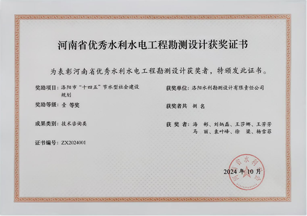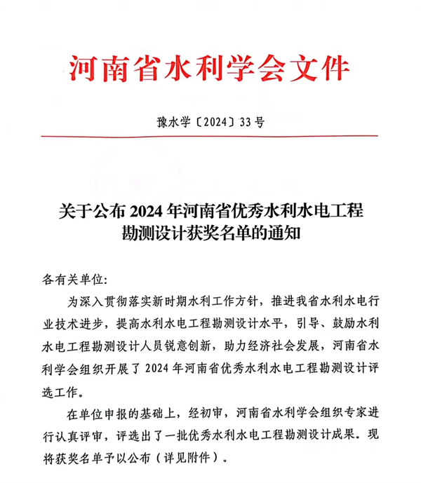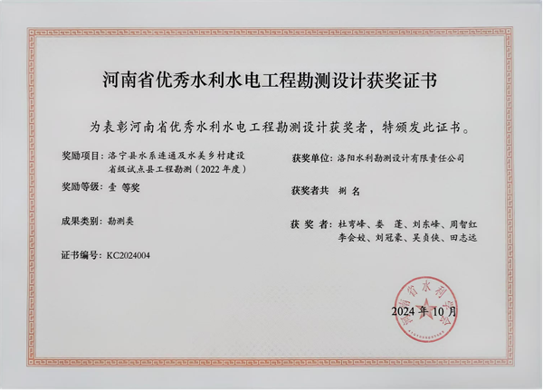 近日,河南省水利學(xué)會(huì)公布了2024年度河南省優(yōu)秀水利水電工程勘測(cè)設(shè)計(jì)獎(jiǎng),洛陽(yáng)水利勘測(cè)設(shè)計(jì)有限責(zé)任公司承擔(dān)的“新安縣水城生態(tài)水系Ⅱ期工程設(shè)計(jì)”、“洛陽(yáng)市十四五節(jié)水型社會(huì)建設(shè)規(guī)劃”和“洛寧縣水系連通及水美鄉(xiāng)村建設(shè)省級(jí)試點(diǎn)縣工程勘測(cè)(2022年度)”3個(gè)項(xiàng)目,分別榮獲設(shè)計(jì)類、技術(shù)咨詢類、勘測(cè)類3個(gè)一等獎(jiǎng)。